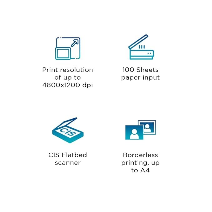 • Page size: A4, A5, A6, B5, LTR, LGL, Executive, Oficio2,B-Oficio, M-Oficio, Legal (India), Foolscap, F4,4 x 6″, 5 x 7″, 7 x 10″, 8 x 10″, Envelopes , Square, Card Size ,Custom Size- Width: 55 – 216 mm, Length: 89 – 1,200 mm; Max paper thickness: 64 to 275 GSM ; Maximum Input Sheet Capacity: 100 sheets (A4); Compatible ink:GI 71 Cyan, Magenta, Yellow, Black; Additional Printer Function: Print modes- Standard and Economy ; Power wattage of printer: OFF: 0.1W, Standby (scanning lamp is off):0.6W, Copying (USB connection to PC): 15W