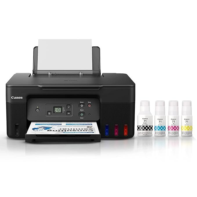 • Special Features: Borderless Print, 1.3 inch display (Monochrome)with backlight; Ideal Usage: Home, Home Office; Included Components: Printer, Power Cord, USB cable, Instruction Manual, 1 set of GI71 Cyan, Magenta, Yellow and Black ink bottles