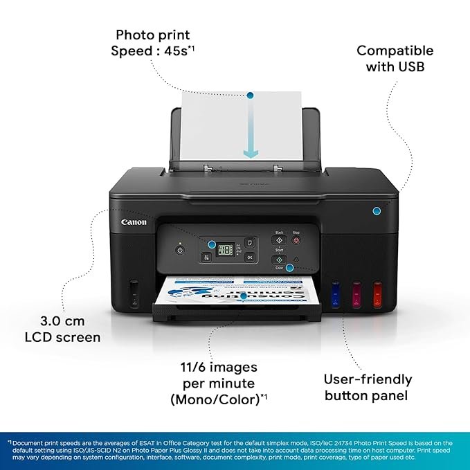 • Printer Type – Ink Tank; Functionality – All-in-One (Print, Scan, Copy); Printer Output – Color. Supports Smart Speakers- Print content through voice activation;Connectivity: WiFi, Wifi Direct, USB, Network, Airprint, Windows Mobile 10, Morpia, Google Cloud Print, Canon Print Service, Pixma Cloud Link, Canon Selphy App ; Compatibility:Windows 10/8.1/7 SP1, Mac OS X 10.10.5 ~ OS X 10.11, Mac OS v10.12 ~ 10.14